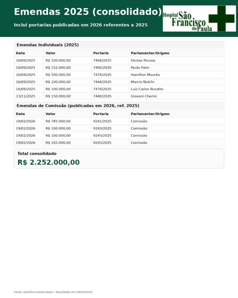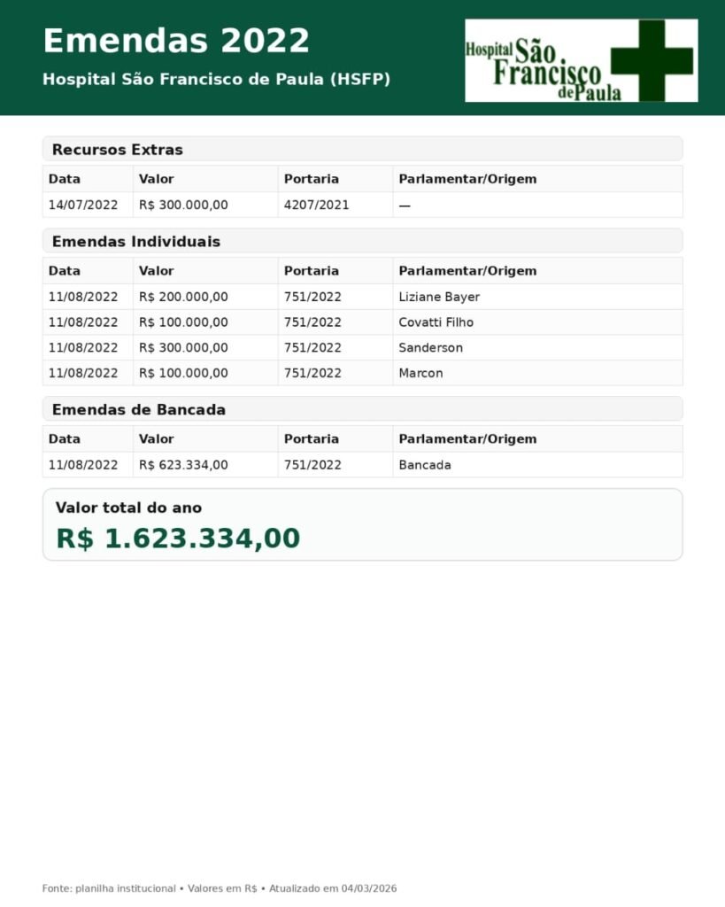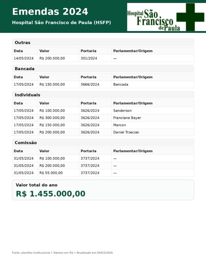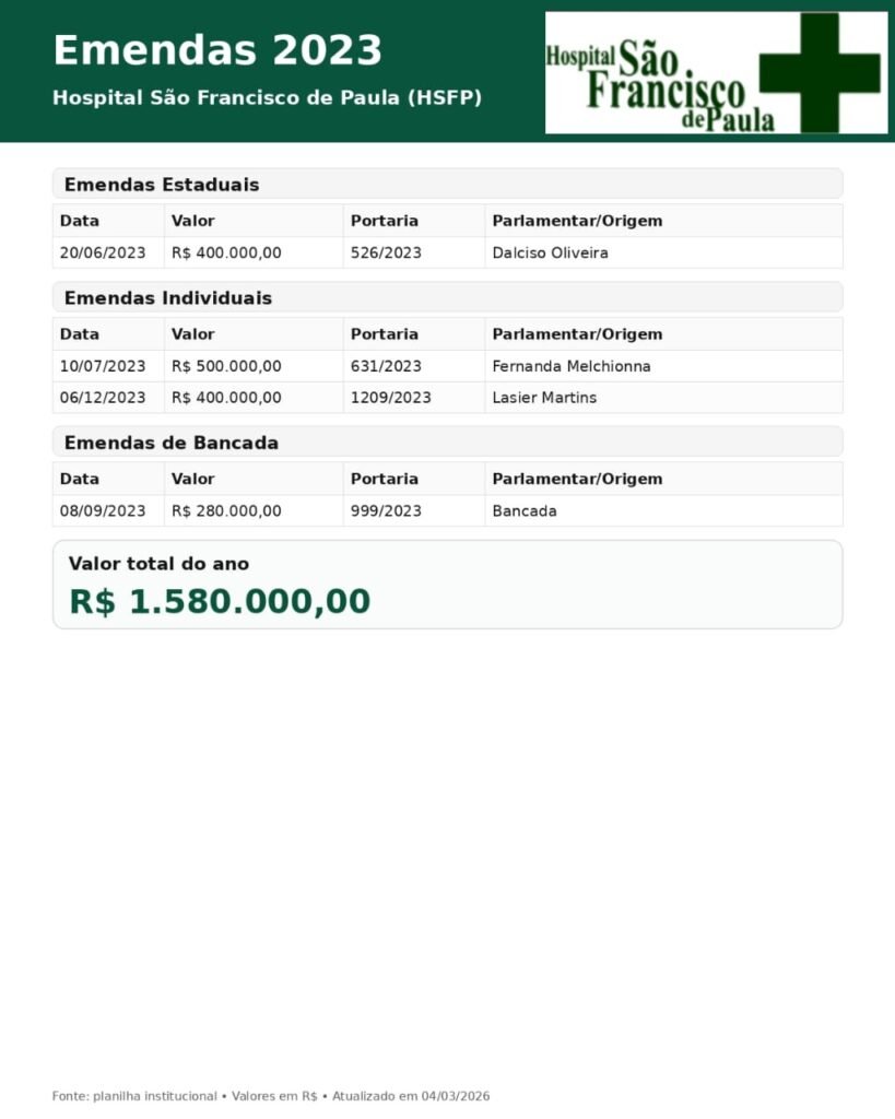 O investimento foi viabilizado por parcerias estratégicas com o poder público, somando recursos do programa Avançar Mais (Governo do Estado) e emendas parlamentares, demonstrando como a cooperação institucional gera resultados concretos e rápidos para a população. “Quando o investimento chega com propósito e boa gestão, ele vira acesso, qualidade e cuidado. O HSFP transforma recurso público em entrega real para a comunidade”, afirma a direção do hospital.